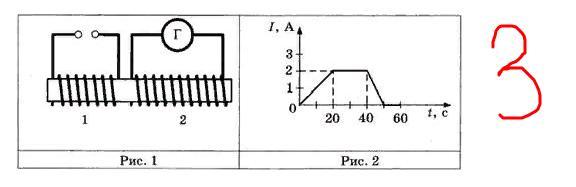 3. Две катушки надеты на стальной сердечник (см. рис. 1 ). Через первую катушку протекает переменный ток, график зависимости которого от времени представлен на рис. 2. Вторая катушка замкнута на гальванометр.