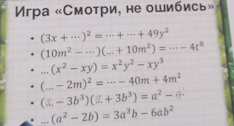 (3х + ... )2 = = ... + ... + 49у? .