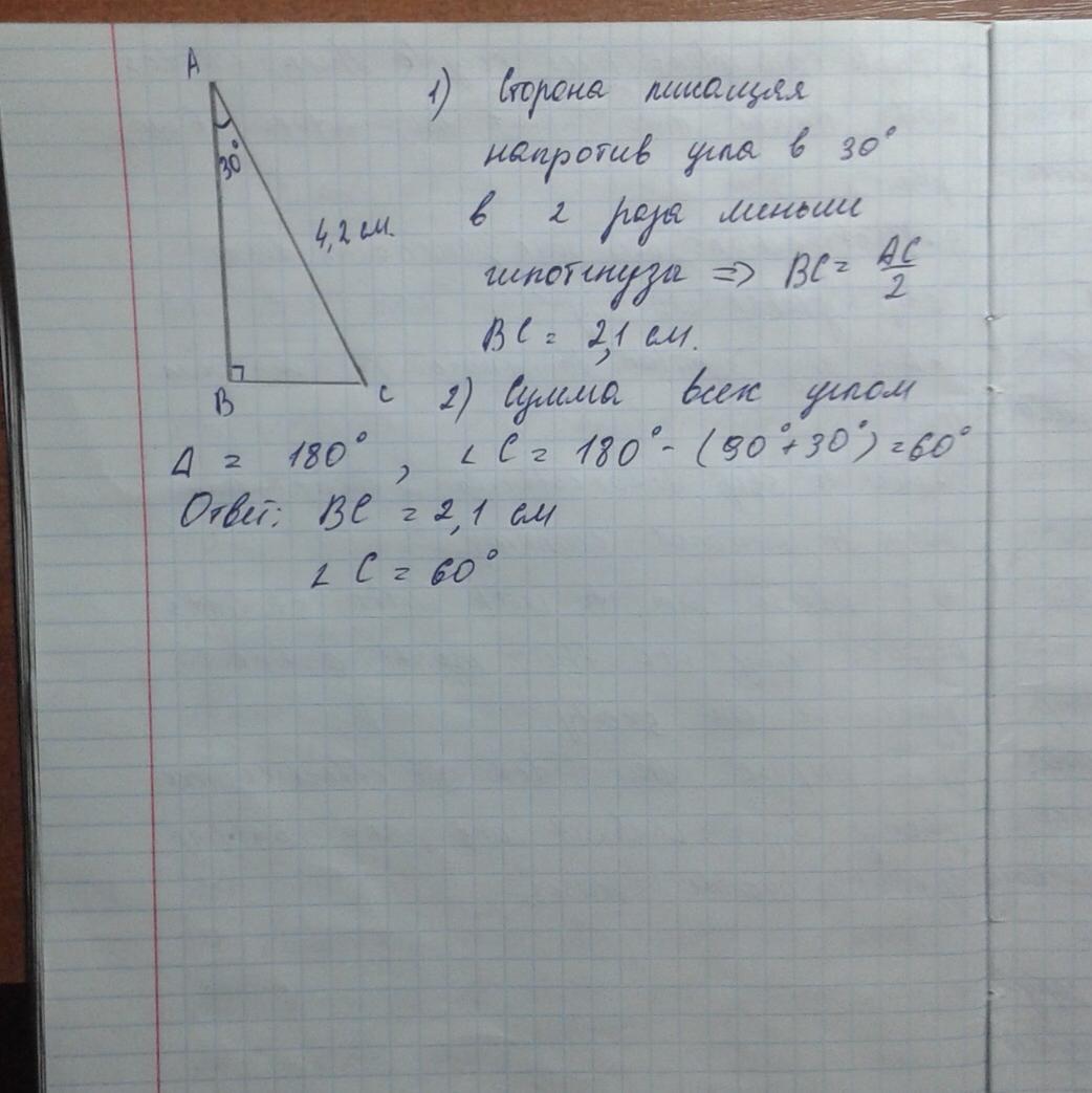СРОЧНО!!!Дано: треугольник АВС,угол А=30,угол В=90,АС=4,2см Найти:ВС,АВ,угол С!!! ПОМОГИТЕ ПЖ!!!!!!