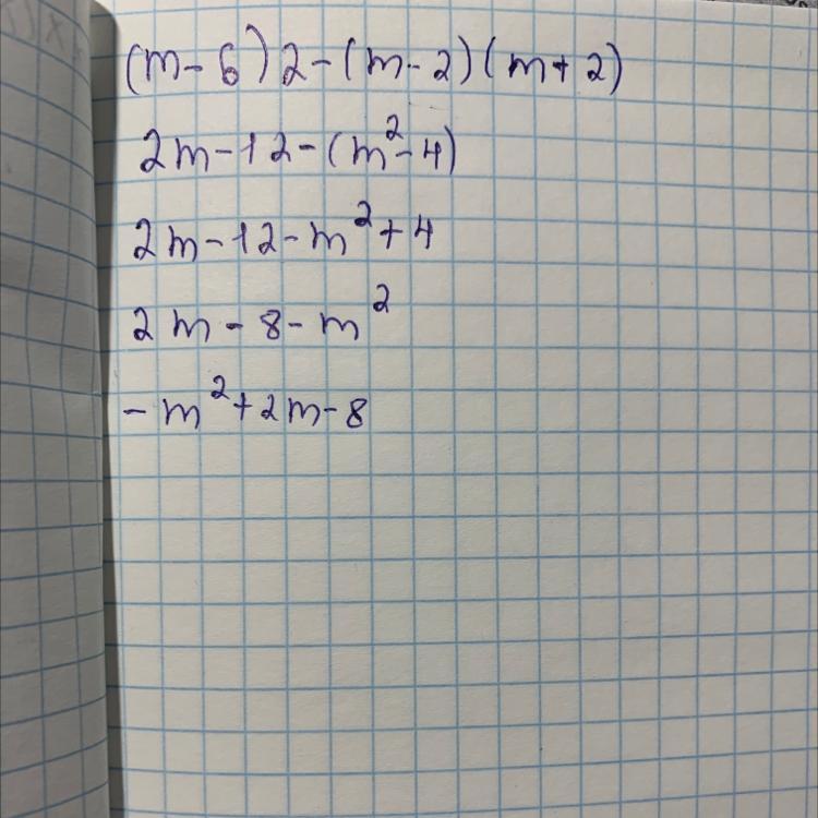 сначала нам нужно раскрыть скобки: (m-6)2 раскрываем их и получаем : 2m-12 дальше с помощью формулы сокращённого умножения мы сокращаем : (m-2)(m+2) и получаем : m^2-4 , и сокращаем до конца и получаем 2m - m ^2- 16