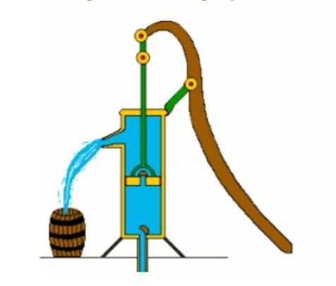 Одновременно под давлением воды открывается клапан внутри поршня, и вода переходит в пространство над поршнем. При последующем движении поршня вверх вместе с ним поднимается и находящаяся над ним вода, которая выливается в бочку. За поршнем поднимается новая порция воды, которая при последующем опускании поршня окажется над ним, и т.д.