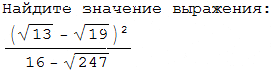 (√13-√19)²/(16-√247)=((√13)²+(√19)²-2*√13*√19)/(16-√247)=(13+19-2√247)/(16-√247)=(2(16-√247))/(16-√247)=2