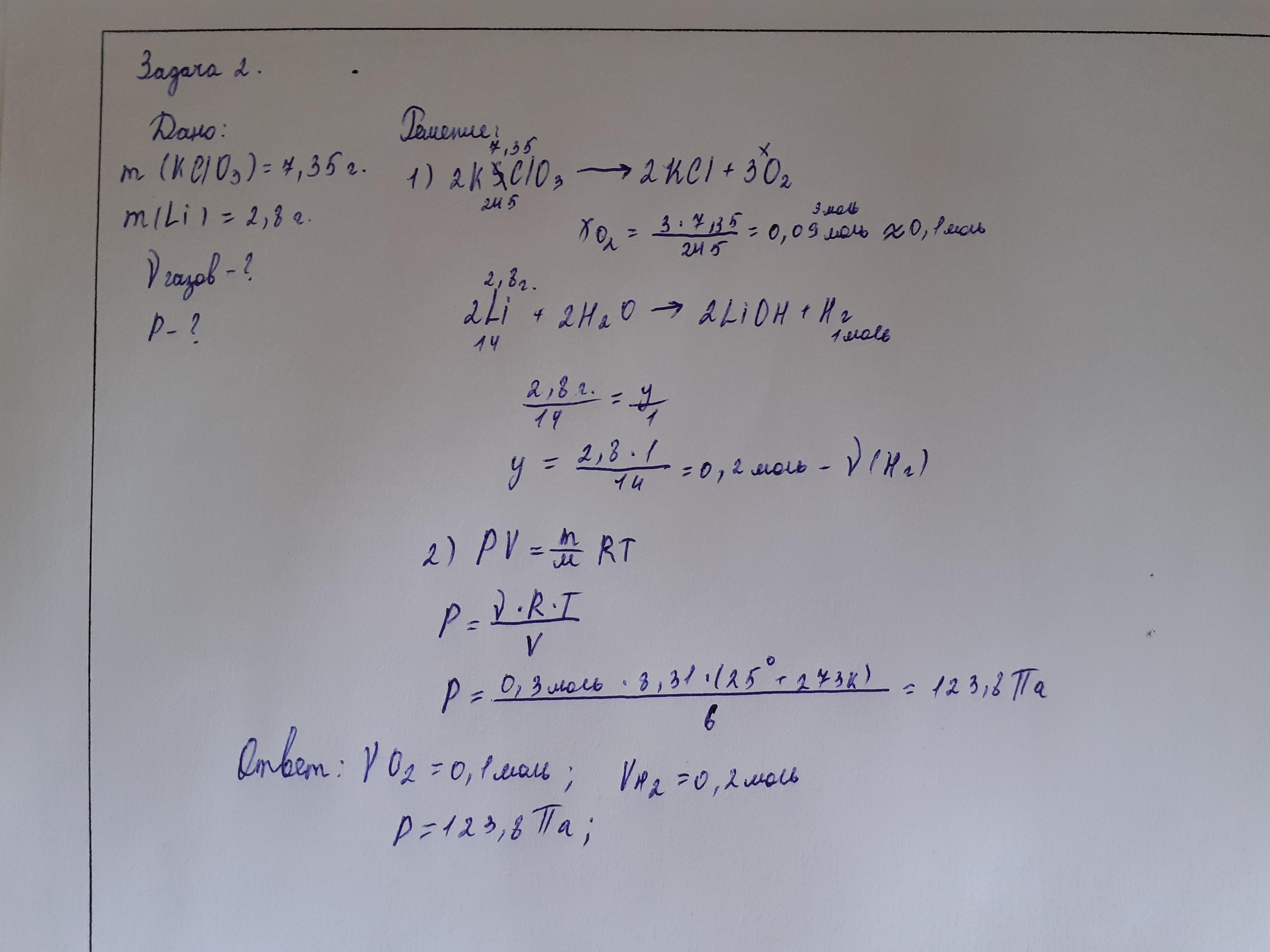 При прокаливании 7,35 г бертолетовой соли образуется газ, который смешали в сосуде вместимостью 6 л с газом, полученным при взаимодействии 2,8 г лития с водой