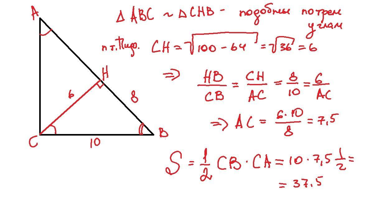 В прямоугольном треугольнике АВС с прямым углом С проведена высота СН из прямого угла поет вс =10см ,а его проекция на гипотенузу 8 см найти высоту СН и площадь треугольника АВС