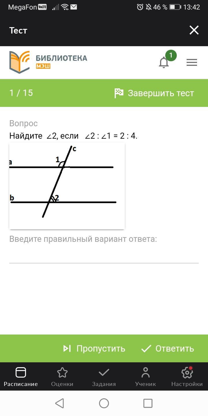 2+4 = 6 , 180 : 6 = 30 , 30 * 2 = 60 , Угол 2 равен 60 градусам !