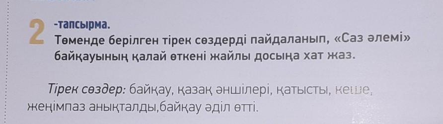 2 тап. Используя данные слова напиши письмо другу как прошёл конкурс *"Саз әлемі "*(Мир музыки).