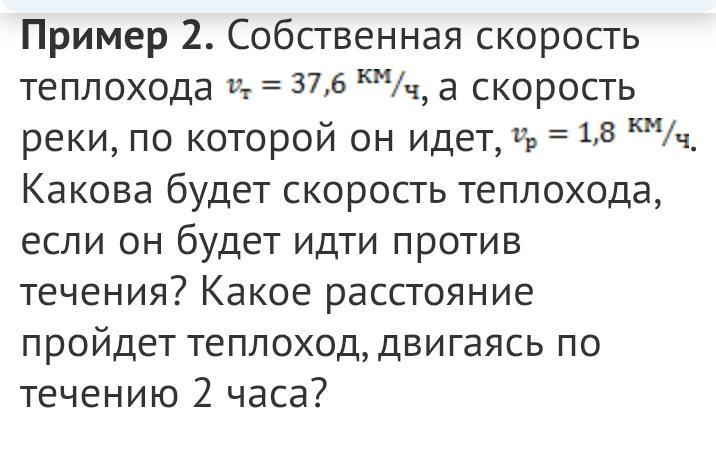 пример 2. собственная скорость теплохода vt=37,6 км/ч, а скорость реки, по которой он идет, vp=1,8км/ч. Какова будет скорость теплохода, если он будет идти против течения? Какое расстояние пройдет теплоход, двигаясь по течению 2 часа?