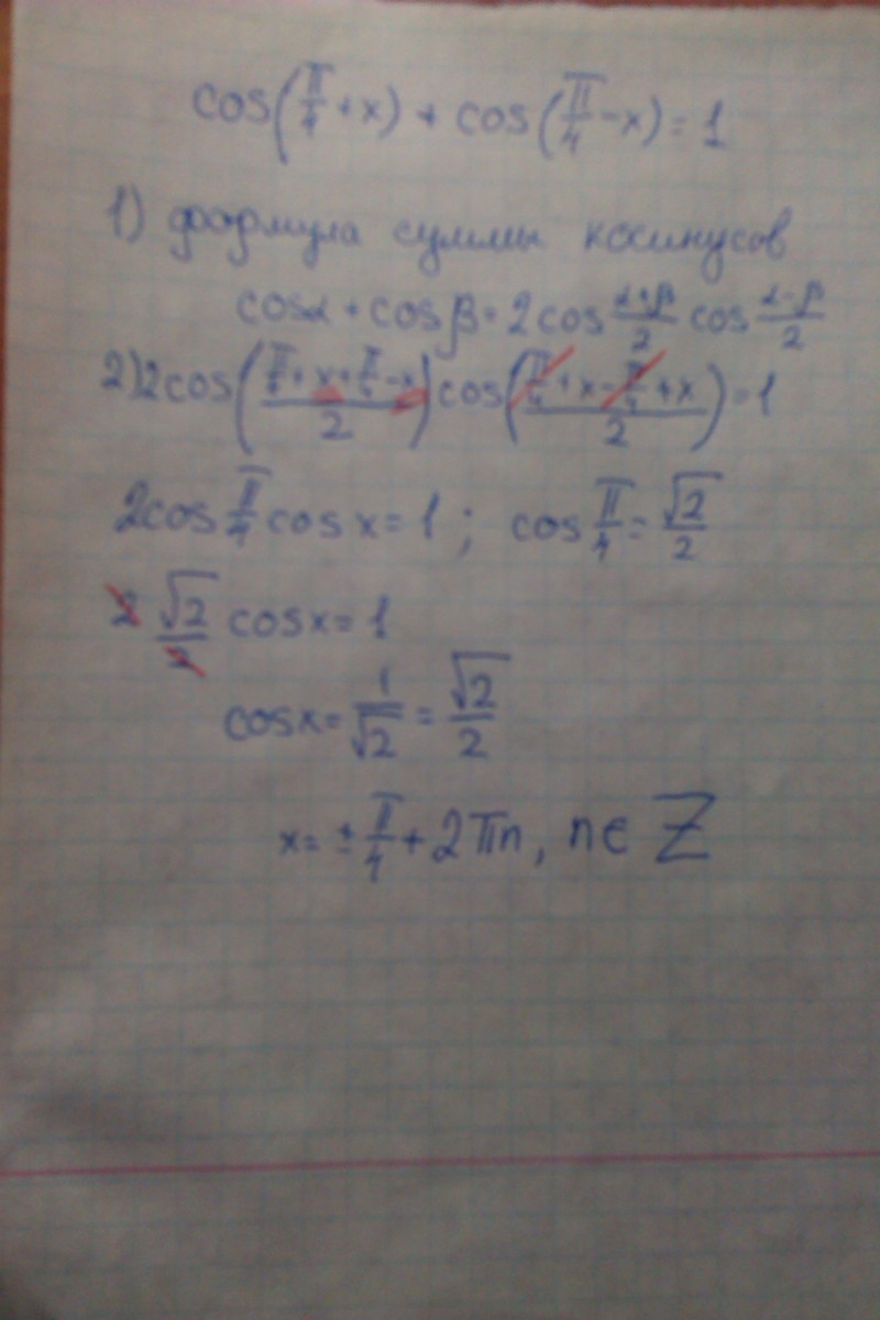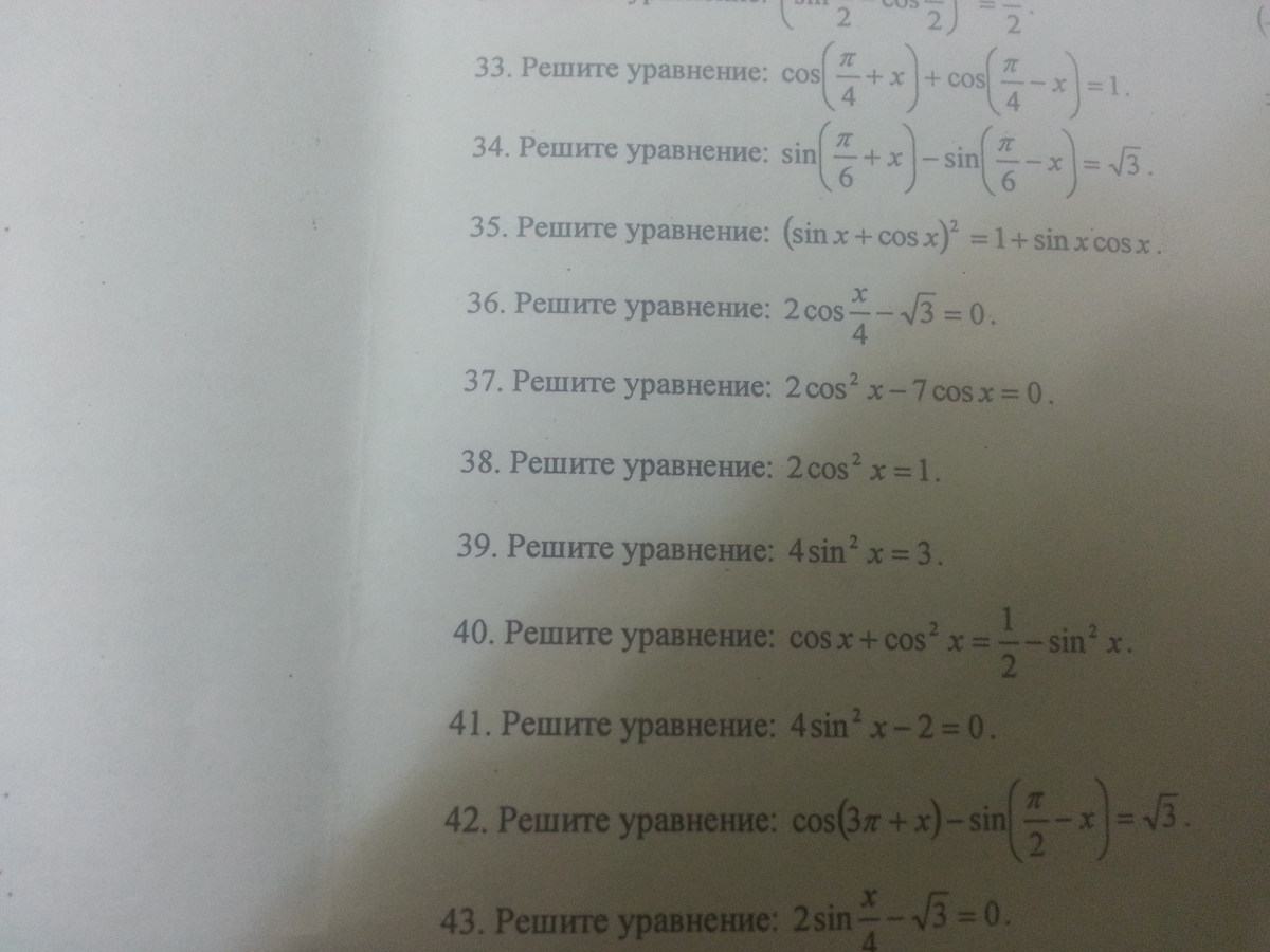 33. Пользуемся формулой суммы косинусов и приводим исходное выражение к виду: 2cos(pi/4)cos(x)=1