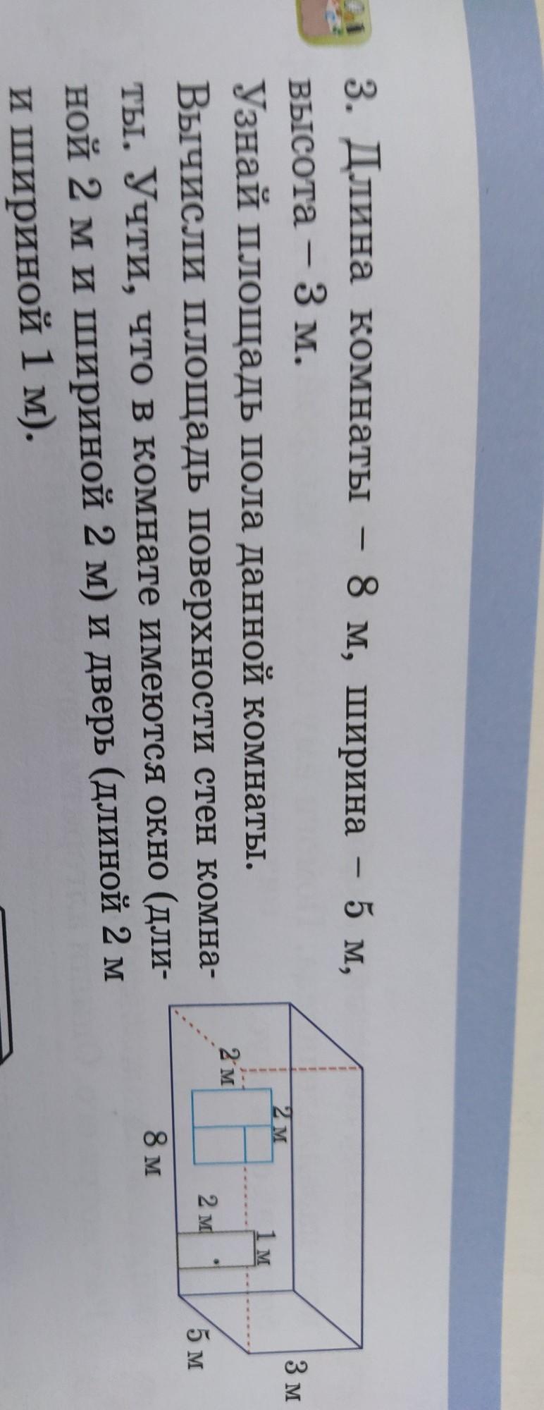 Ответ: площадь пола комнаты 40 м²; площадь стен комнаты 102 м².