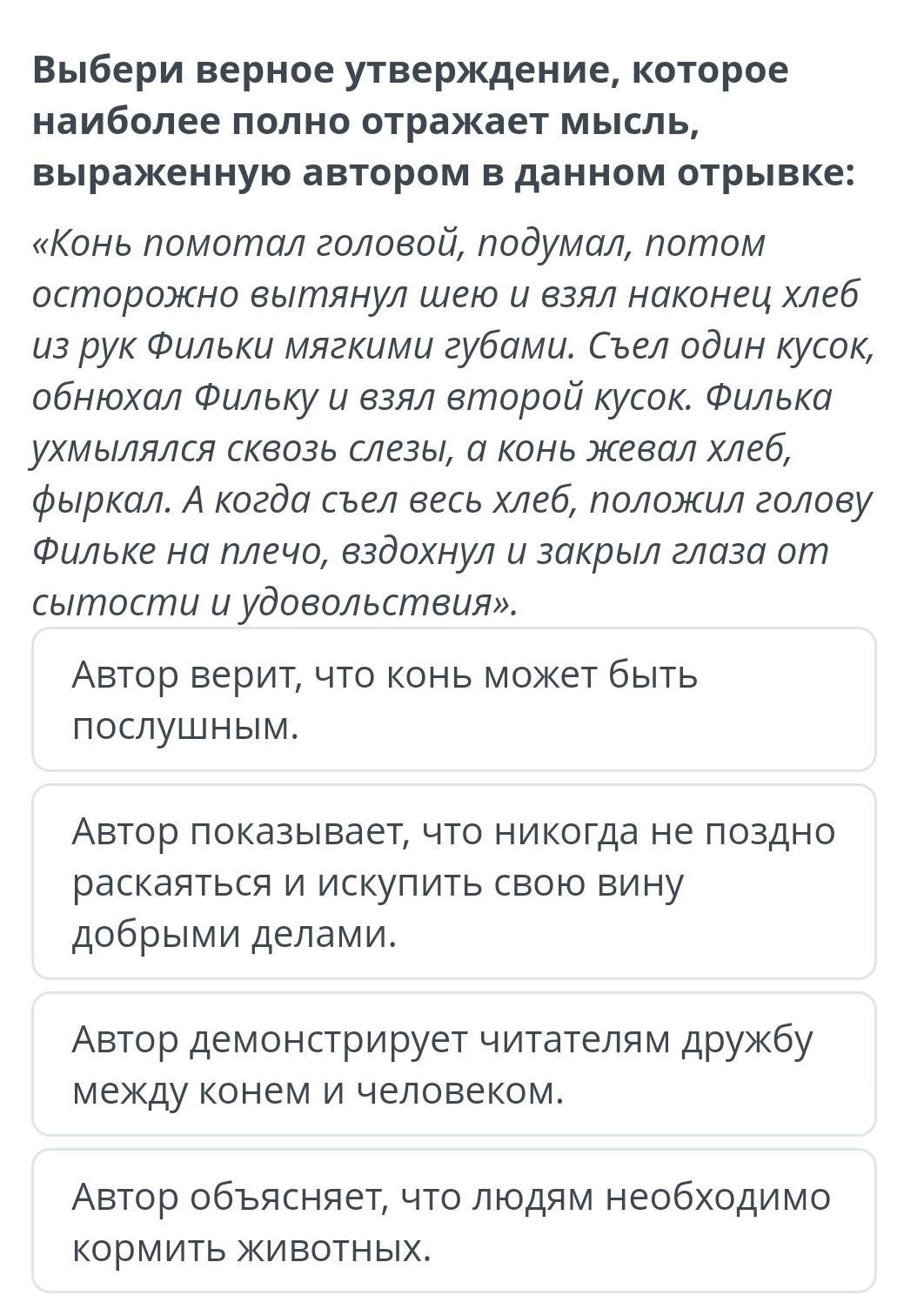 Выбери верное утверждение, которое наиболее полно отражает мысль, выраженную автором в данном отрывке: «Конь помотал головой, подумал, потом осторожно вытянул шею и взял наконец хлеб из рук Фильки мягкими губами. Съел один кусок, обнюхал Фильку и взял второй кусок. Филька ухмылялся сквозь слезы, а конь жевал хлеб, фыркал. А когда съел весь хлеб, положил голову Фильке на плечо, вздохнул и закрыл глаза от сытости и удовольствия». Автор верит, что конь может быть послушным. Автор показывает, что никогда не поздно раскаяться и искупить свою вину добрыми делами. Автор демонстрирует читателям дружбу между конем и человеком. Автор объясняет, что людям необходимо кормить животных.