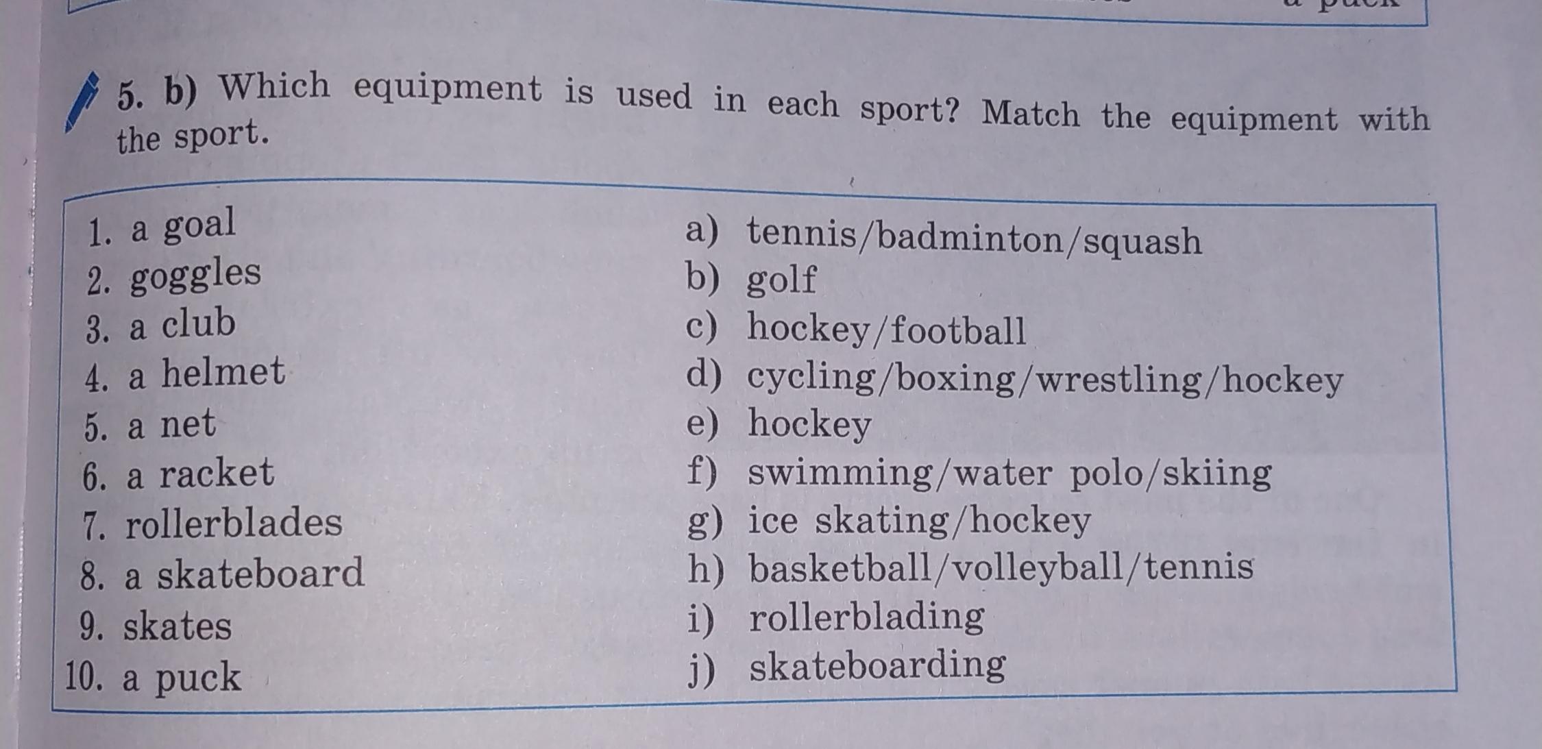 Какое оборудование используется в каждом виде спорта? Сопоставьте оборудование со спортом.