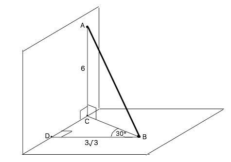 Концы отрезка АВ лежат в перпендикулярных плоскостях. AC и BD - перпендикуляры, проведенные к линии пересечения этих плоскостей, AC = 6 м, BD = 3 корень из 3 м. Найдите длину отрезка АВ, если угол DBC = 30