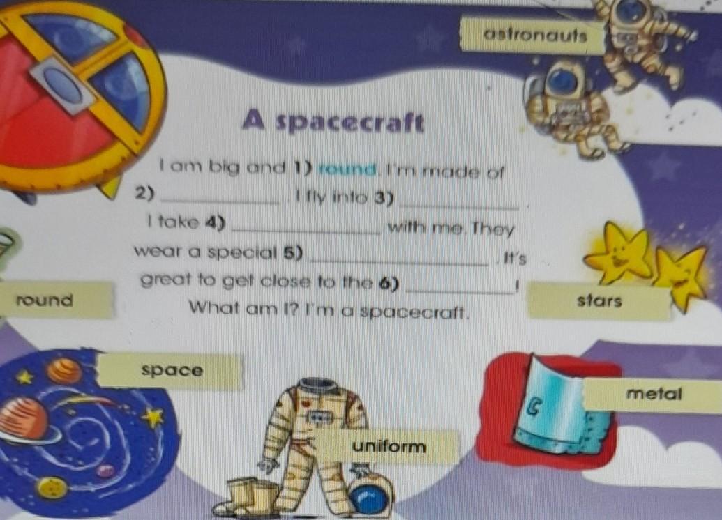 I am big and round. I am made of metal. I fly into space. I take astronauts with me. They wear a special uniform. It's great to get close to the stars! What am i? I am spacecraft