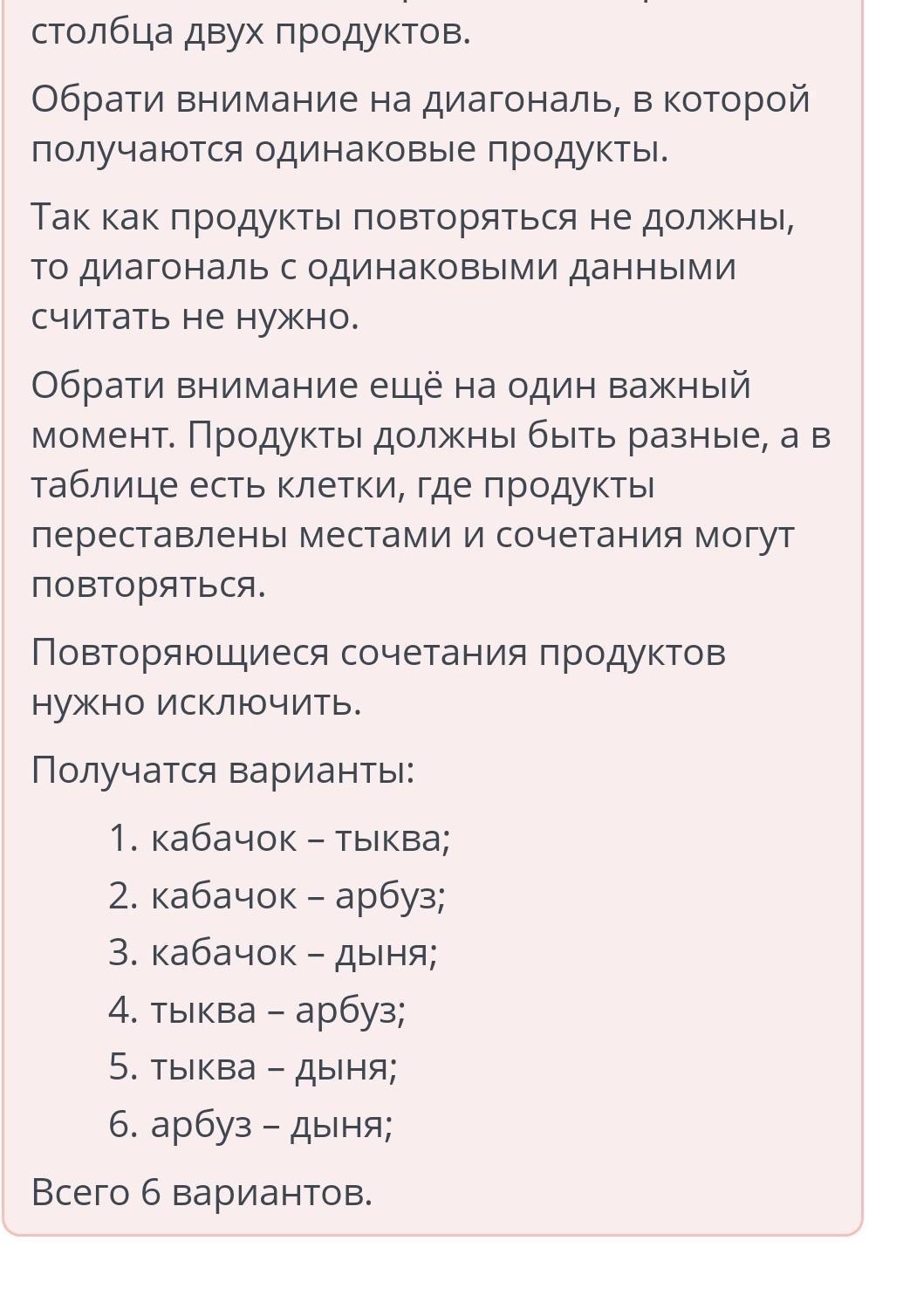 Арман был на базаре и хотел купить кабачок, тыкву, арбуз и дыню. Но в сумку могут поместиться только два из них. Сколько вариантов покупки есть у Армана? Отметь решение в таблице знаком «+». Запиши ответ.