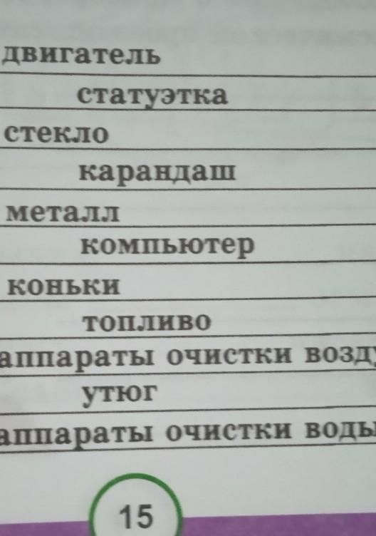 Ответ: Двигатель, стекло, металл, компьютер, топливо, аппараты очистки воздуха, аппараты очистки воды.