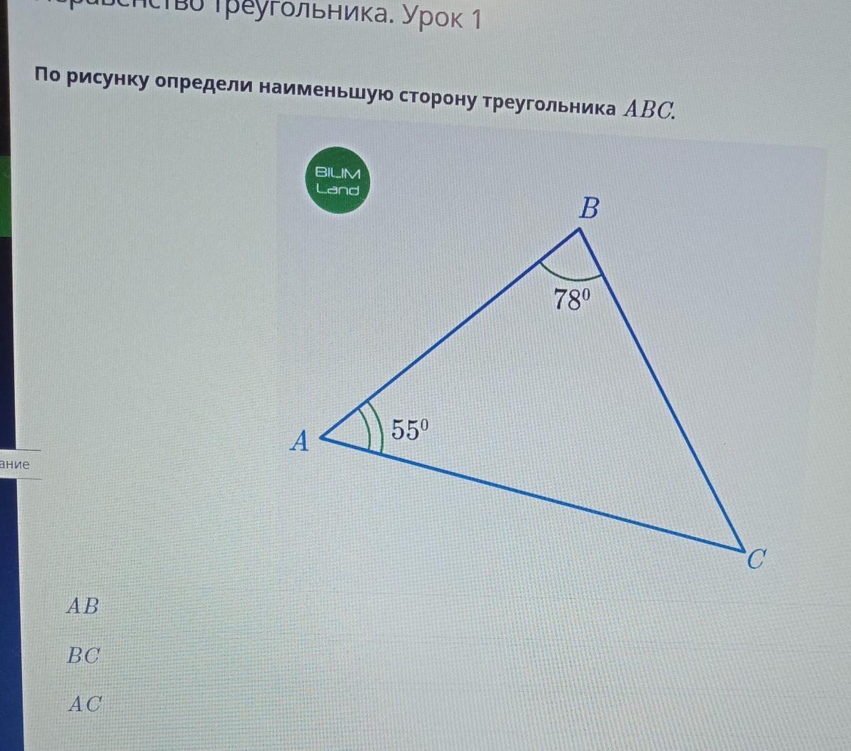 следовательно, т.к. против меньшего угла лешит меньшая сторона, то наименьшая сторона этого треугольника - АВ.