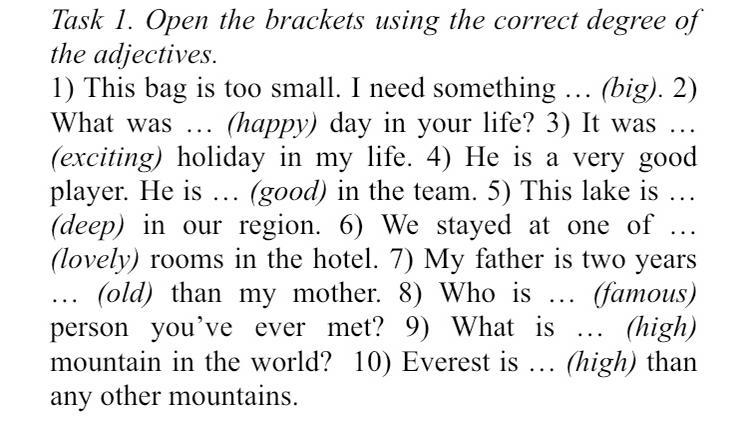 1) This bag is too small, I need something bigger. 2) what was the happiest day in your life? 3)It was the most exciting holiday in my life. 4) He is a very good player. He is the best in the team. 5) This lake is the deepest in our region. 6) We stayed at one of the most lovely/loveliest rooms in the hotel. 7)My father is two years older than my mother. 8)Who is the most famous person you've ever meet? 9)What is the highest mountain in the world? 10)Everest is higher than any other mountains.