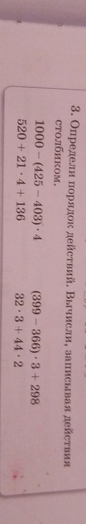 Ответ: 1. 912 сначала надо 425 -403,после от 1000 отнять то число которое получиться а точне 22,и умножить на 4; 2.Первым надо 21 умножить на 4 и добавить к этому числу 520 будет 604 и +136=740; 3. Решаем действие в скобках,будет 33, умножаем 33 на три,будет 99,и 99 + 298=397; 4.32 умножить на 3 =96 + 44 умножить на два =96+88=184