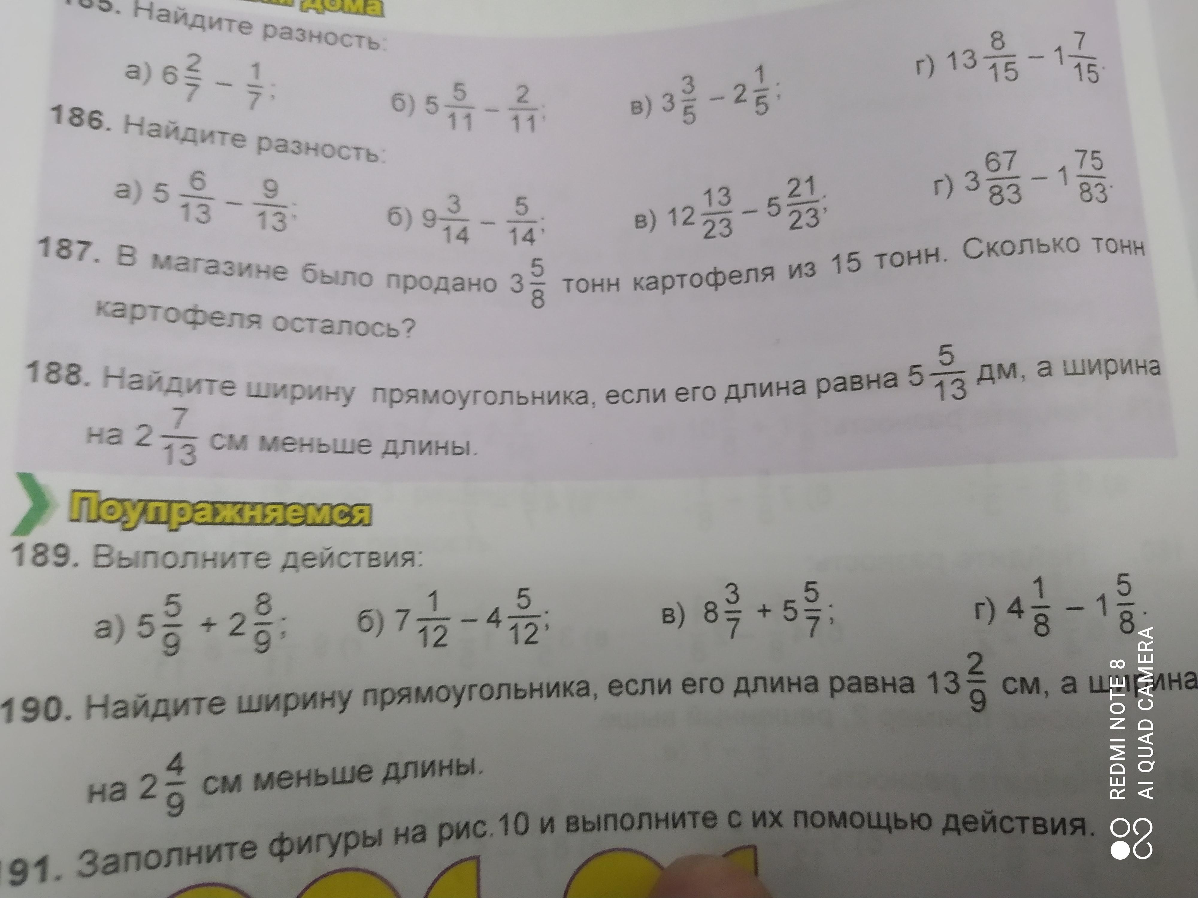 5 5/13-2 7/13=4 18/13-2 7/13=2 11/13 ширина прямоугольника