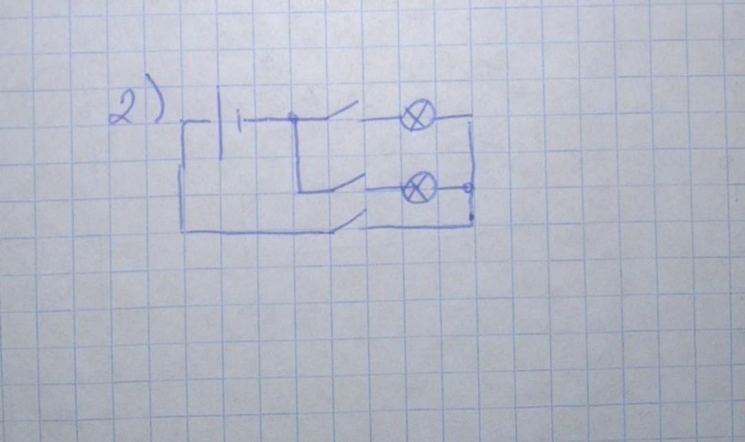 Накресліть схему з'єднання батареї акумуляторів, двох лампочок і трьох ключів у коло, у якому кожною з лампочок керує свій ключ, а розмикання третього ключа приводить до вимикання обох лампочок.