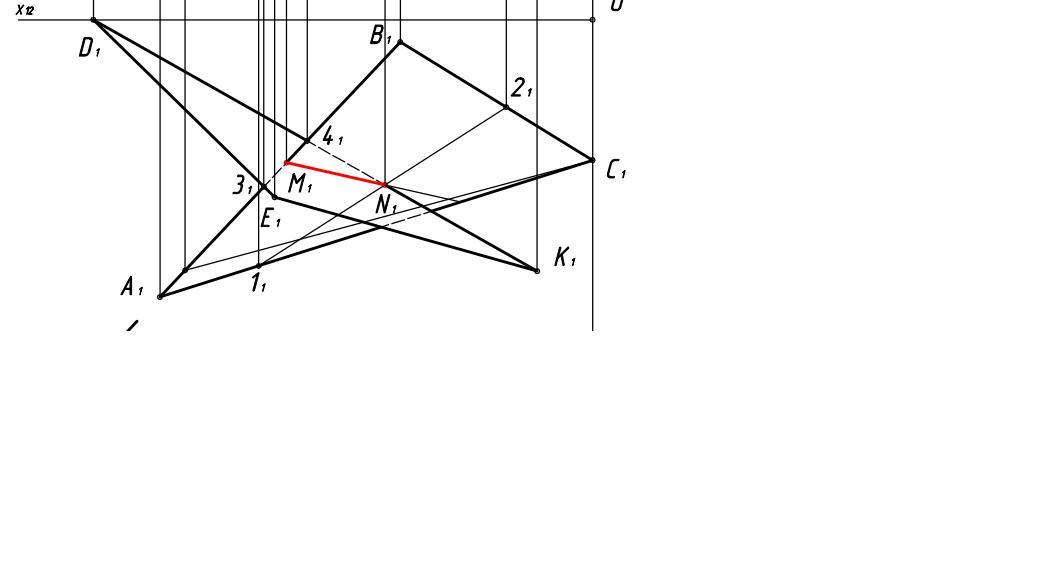 Определена линия пересечения плоскостей этих треугольников и видимость их сторон.
