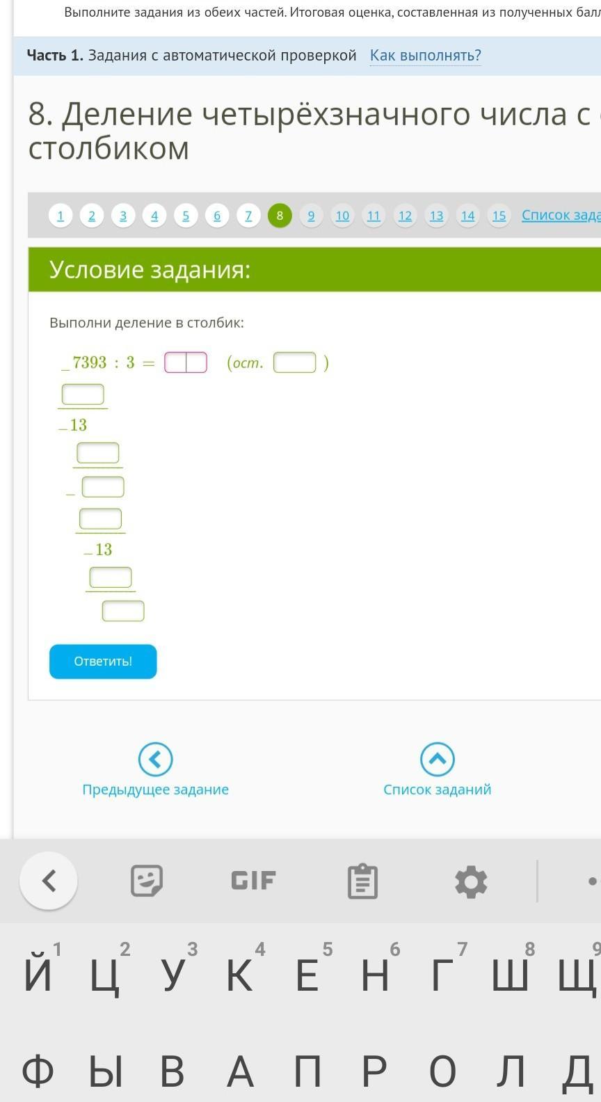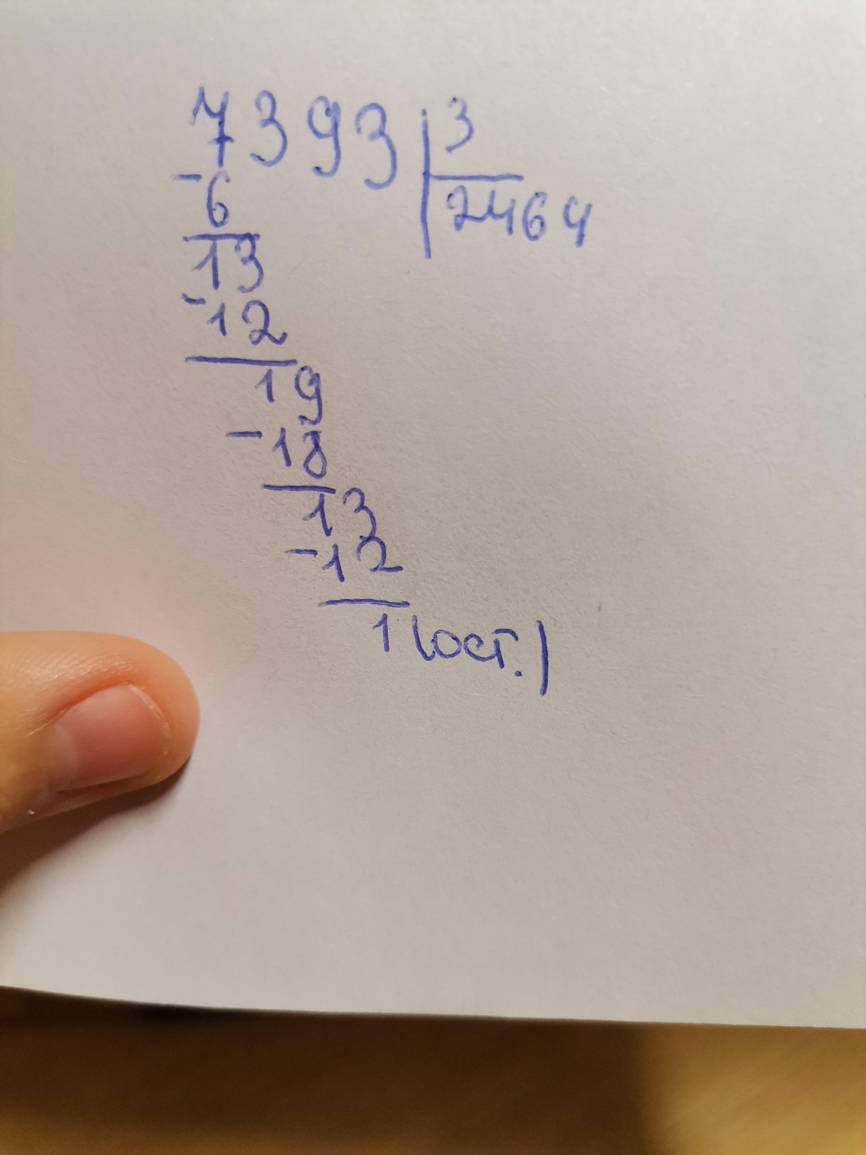 7393:3=7-6=13-12=19-18=13-12=1 Это вычитание вниз ОТВЕТ: 2464 остаток 1