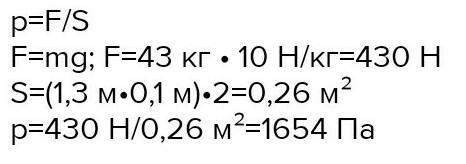 Мальчик массой 43 кг стоит на лыжах. Длина каждой лыжи равна 1,5 м, ширина равна 9 см.