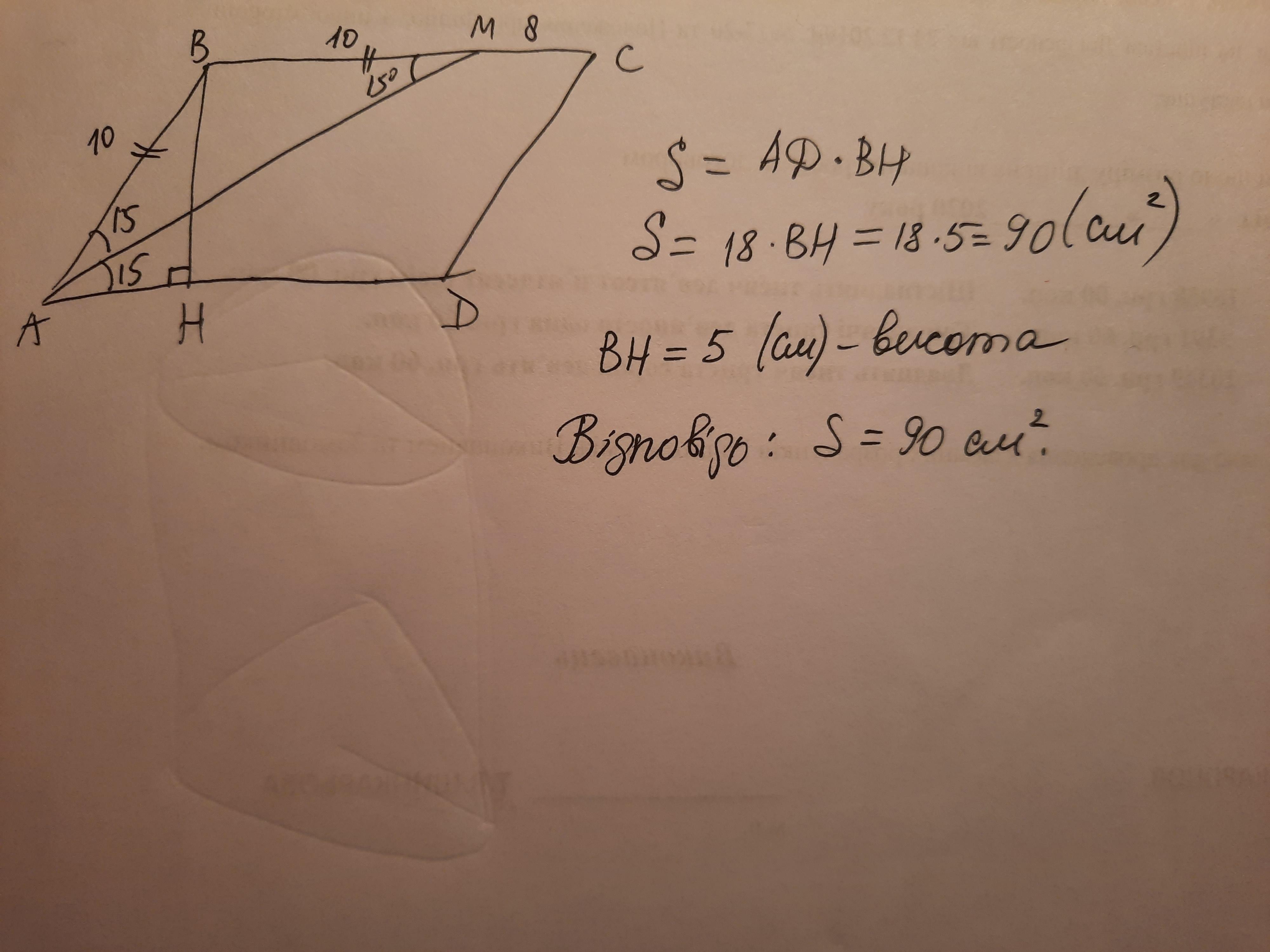 Бісектриса AM паралелограма ABCD ділить сторону BC на відрізки BM=10см, MC=8см. Знайдіть площу паралелограма, якщо кут A=30°