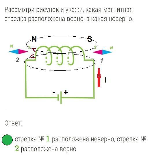 Рассмотри рисунок и укажи, какая магнитная стрелка расположена верно, а какая неверно.