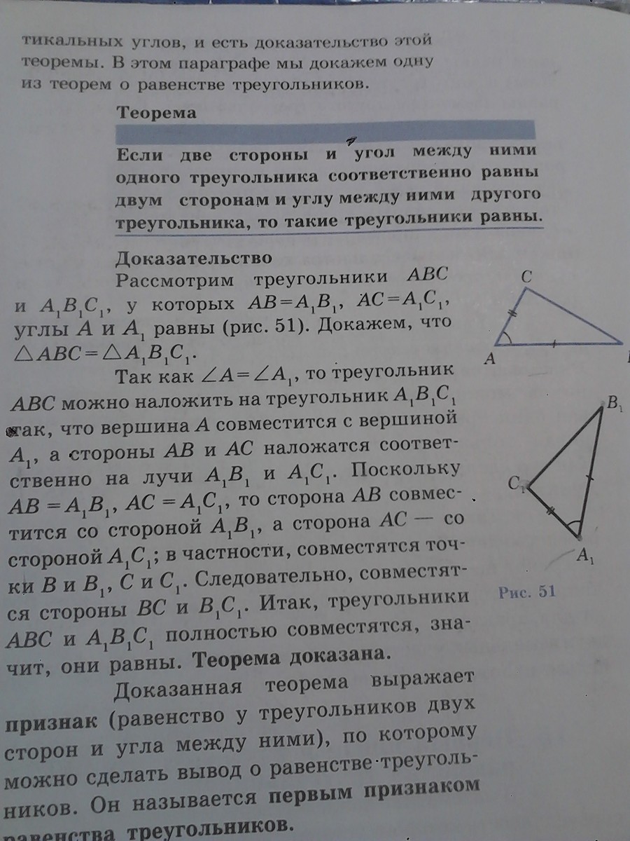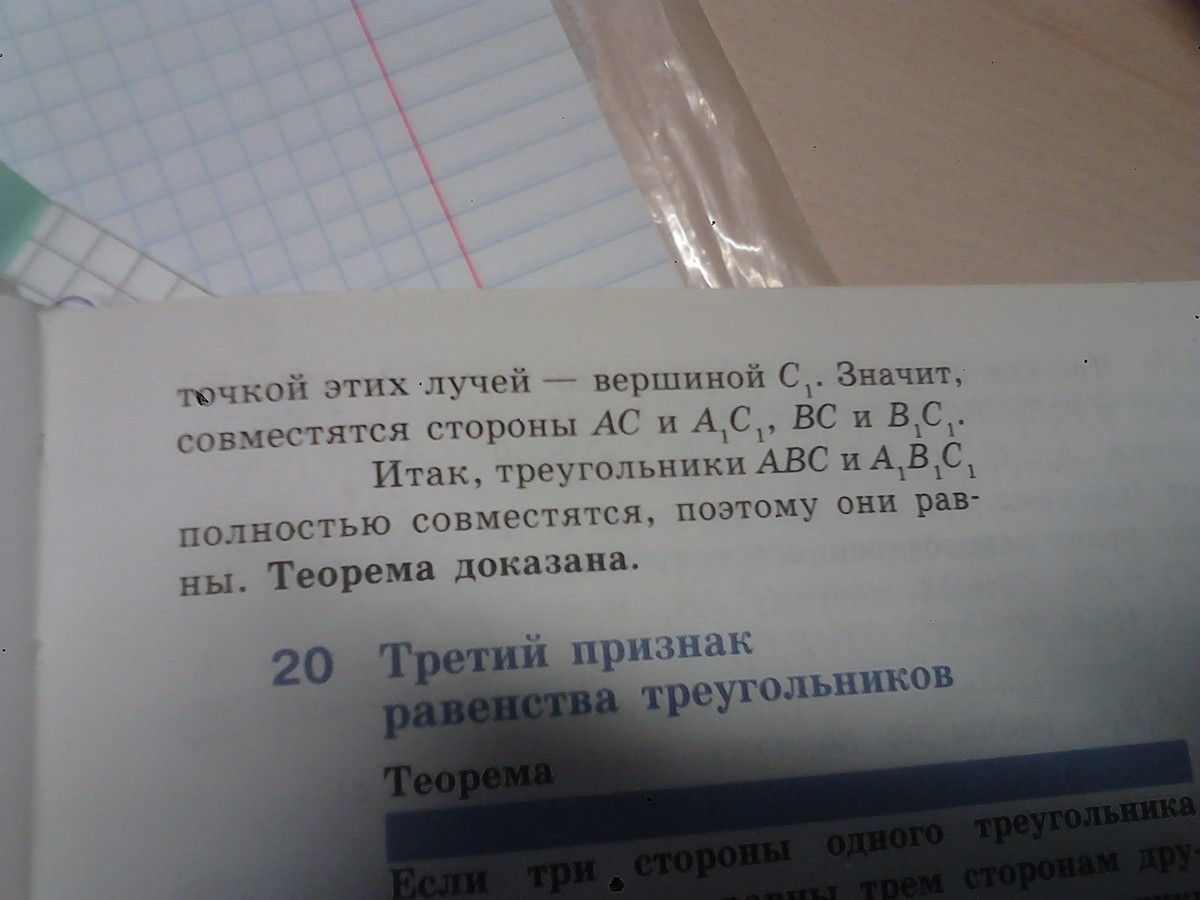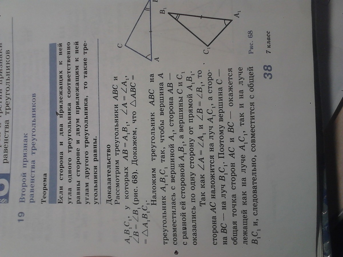 1 теорема треугольника,по 2-м сторонам и углу между ними.Вторая теорема,по стороне и 2-м прилежащим к ней углам.