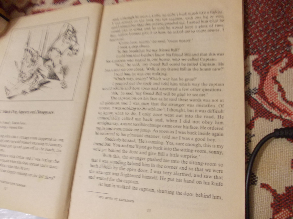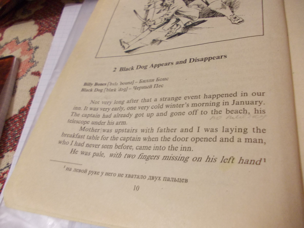 На левой руке у него не хватала 2 пальца,и хотя он носил нож,он не был похож на убийцу.Я всегда наблюдала за моряками,1-ой или 2умя ногами,и я помню одного человека(дальше слово не видно).Я спршивала его что он хотел бы выпить и он отвечал стаканчик рома.Но прежде чем я могла принести ему,он просил подойти ближе.Я колебалась.