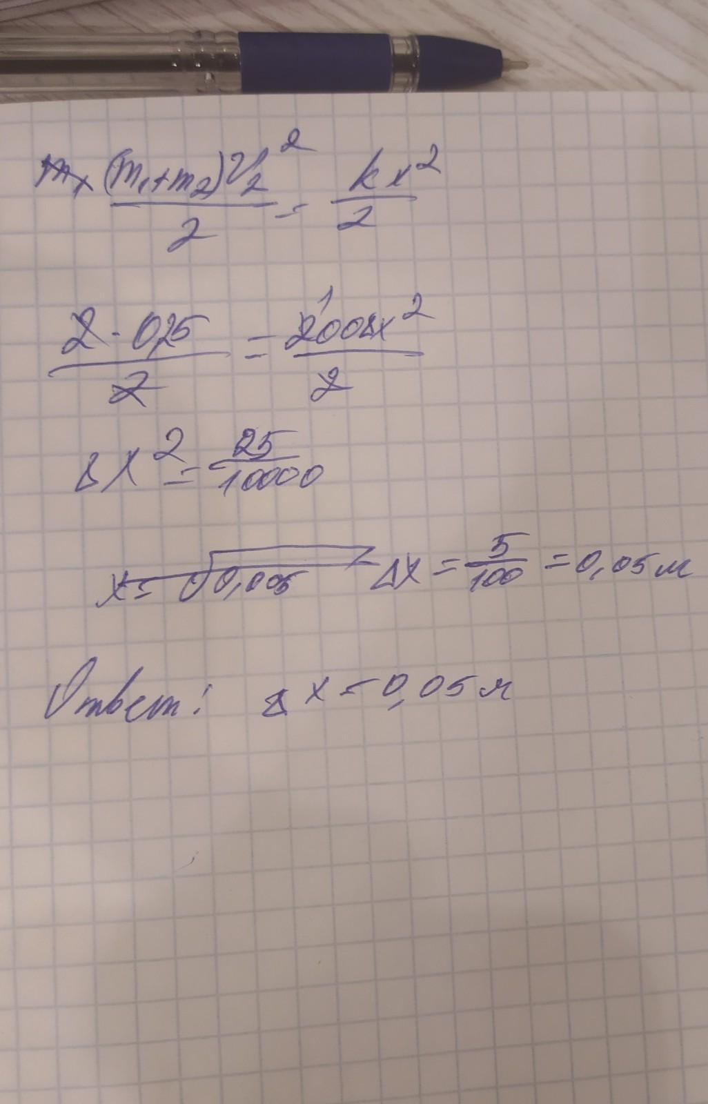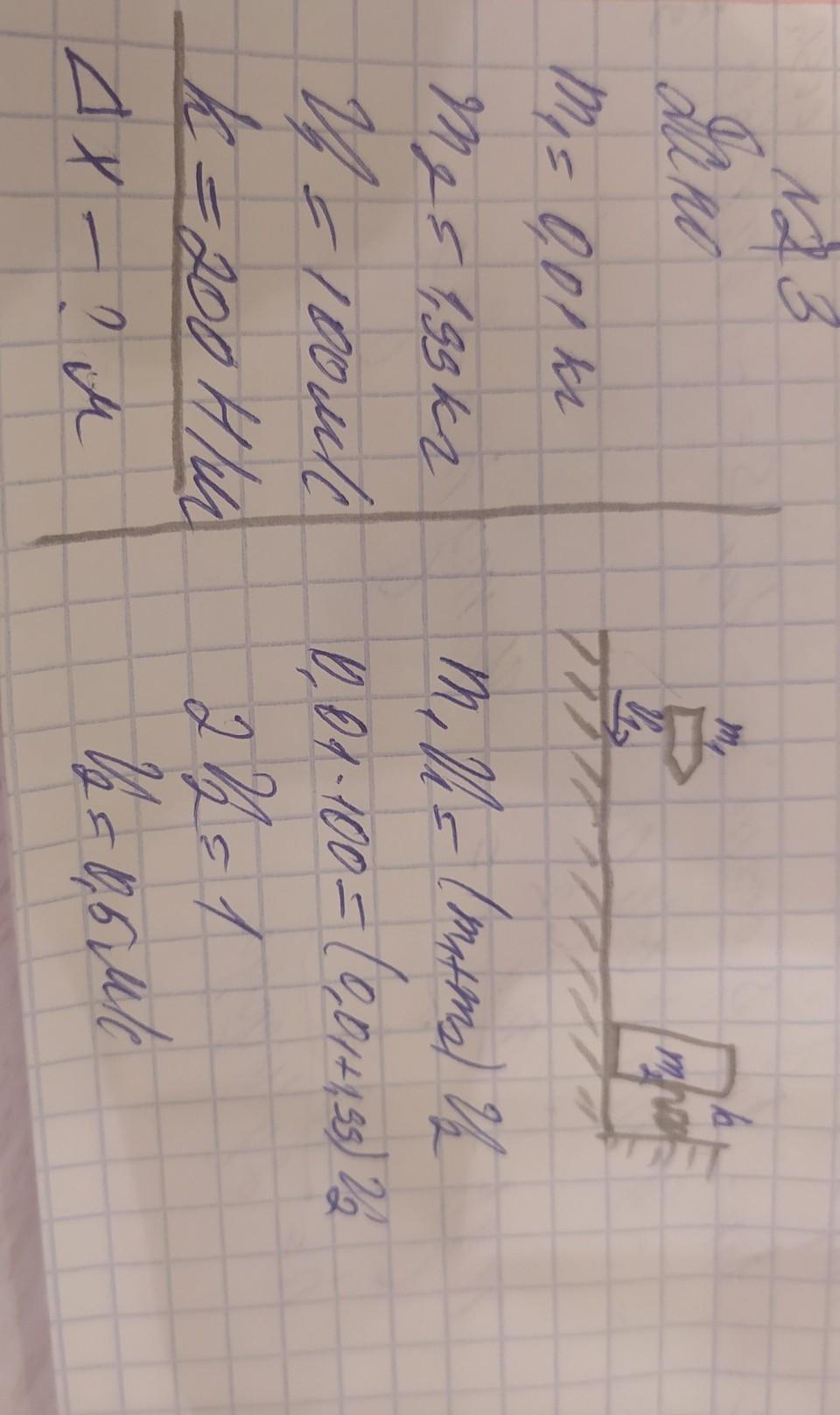 Пуля массой m=10г со скоростью v=100м/с попадает в тело массой M=1,99кг и застревает в нем (рис. 3.9.2). На сколько сжимается пружина, удерживающая тело? Жесткость пружины k = 200H/м.