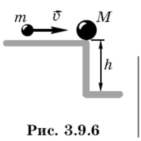 Гладкий шар массой M=100г лежит на краю стола высотой h=1,225м (рис. 3.9.6). В центр шара попадает пуля массой m=5г, летящая горизонтально со скоростью v=100м/с, и, пробив его, падает на горизонтальную поверхность на расстоянии s = 10м от стола. На каком расстоянии от стола упадет шар? Временем взаимодействия пули и шара, а также сопротивлением воздуха пренебречь.