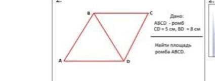 Диагональ ВD делит ромб на два равных треугольника со сторонами 5 см, 5 см и 8 см. Найдем их площадь по формуле Герона.