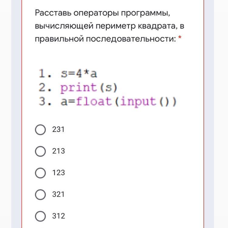 Расставь операторы программы, вычисляющей периметр квадрата, в правильной последовательности: