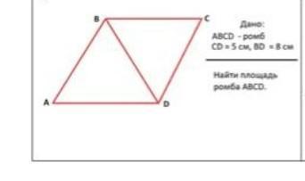 Диагональ ВD делит ромб на два равных треугольника со сторонами 5 см, 5 см и 8 см. Найдем их площадь по формуле Герона.