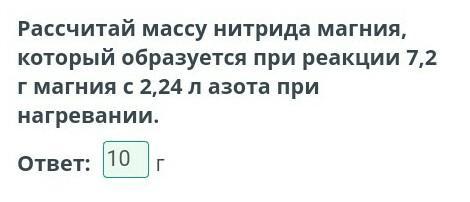 Рассчитай массу нитрида магния который образуется при реакции 7,2 Г магния с 2,24 л азота при нагревании