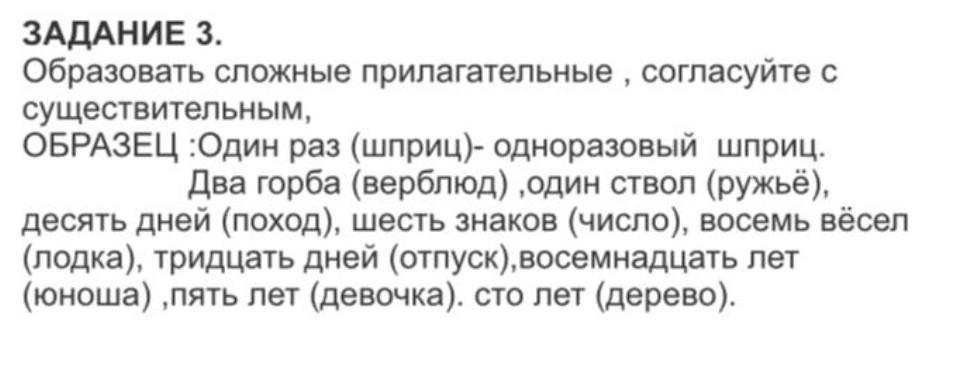 Двугорбый верблюд, одноствольное ружъё, десятидневный поход, шестизначное число, восьмивёсельная лодка, тринадцатидневный отпуск, восемнадцатилетний юноша, пятилетняя девочка, столетнее дерево.