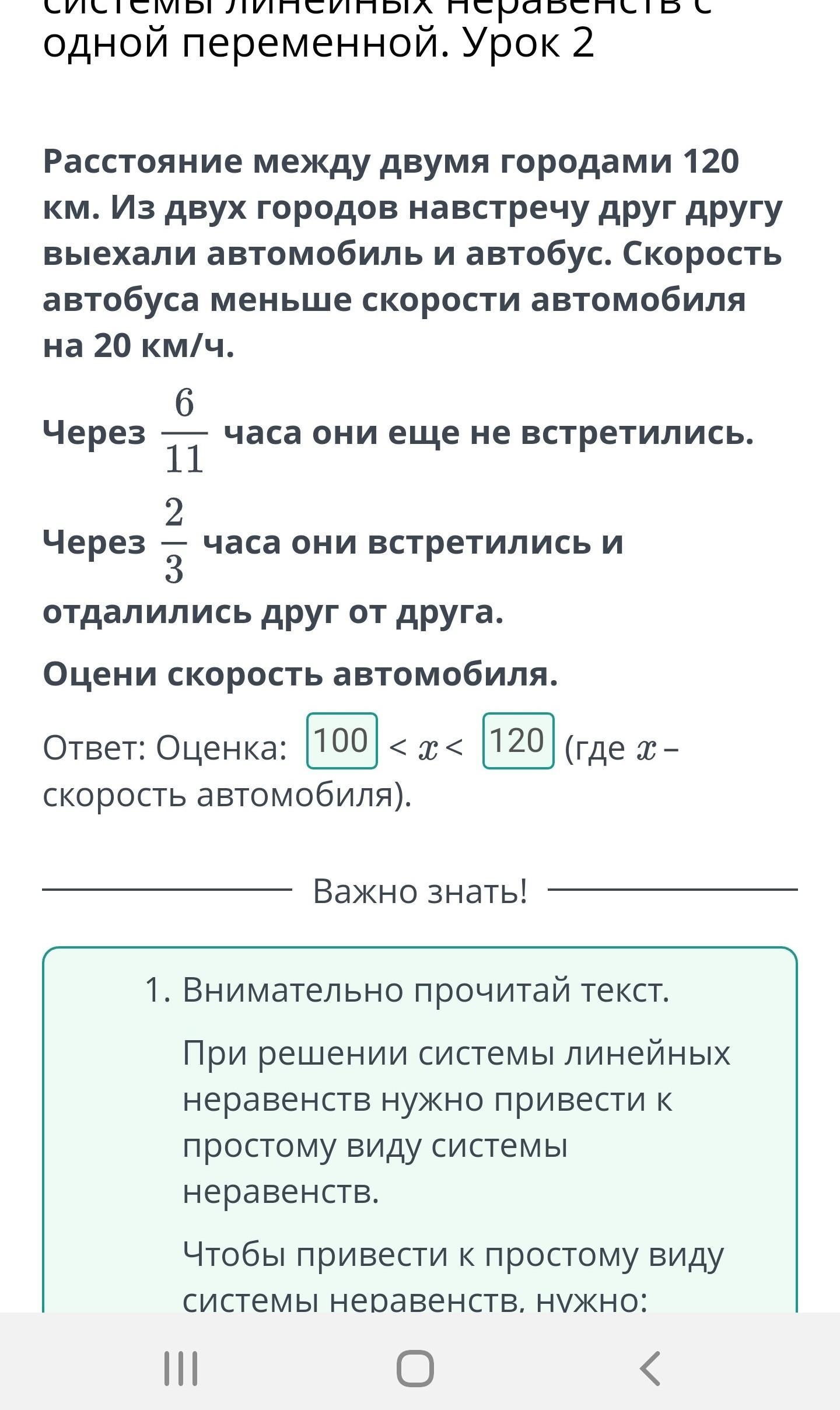 Расстояние между двумя городами 120 км. Из двух городов навстречу друг другу выехали автомобиль и автобус. Скорость автобуса меньше скорости автомобиля на 20 км/ч. Через часа они еще не встретились. Через часа они встретились и отдалились друг от друга. Оцени скорость автомобиля. Ответ: Оценка: < x < (где x – скорость автомобиля).