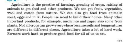 Сельское хозяйство - это практика земледелия, выращивания сельскохозяйственных культур, разведения животных для получения еды и других продуктов. Мы можем получать фрукты, овощи, шерсть и хлопок от природы. Также мы можем получать пищу от животных: мент, яйца и молоко. Люди строят дома из дерева. Многие другие важные продукты, например, лекарства и бумага, также производятся из растений. Не все культуры могут расти повсюду, потому что почвы и температуры в разных местах разные. Сельское хозяйство требует много тяжелого труда. Фермеры упорно трудиться, чтобы произвести хорошее питание для всех нас, чтобы поесть.