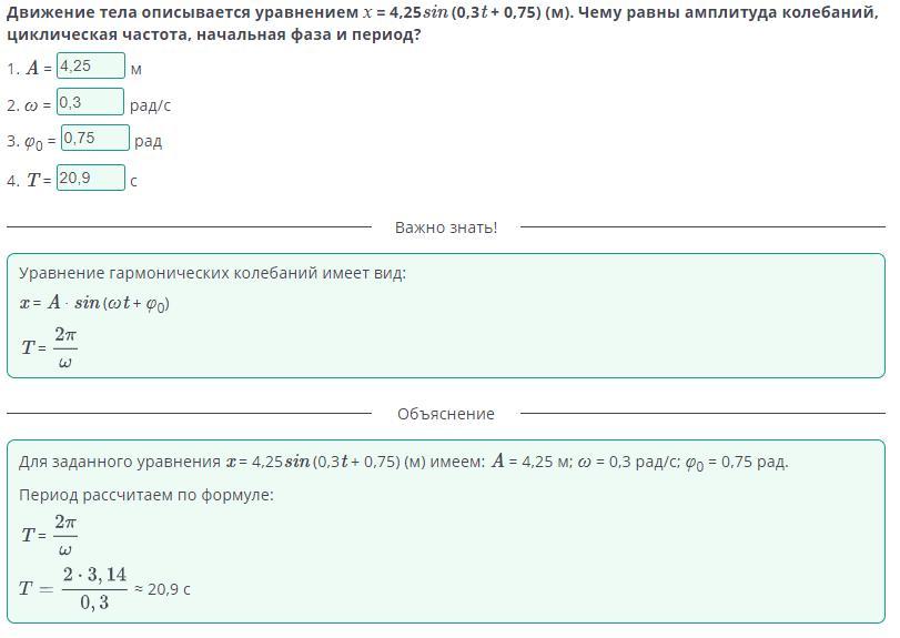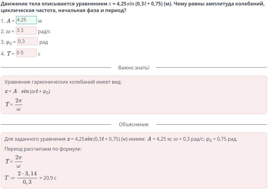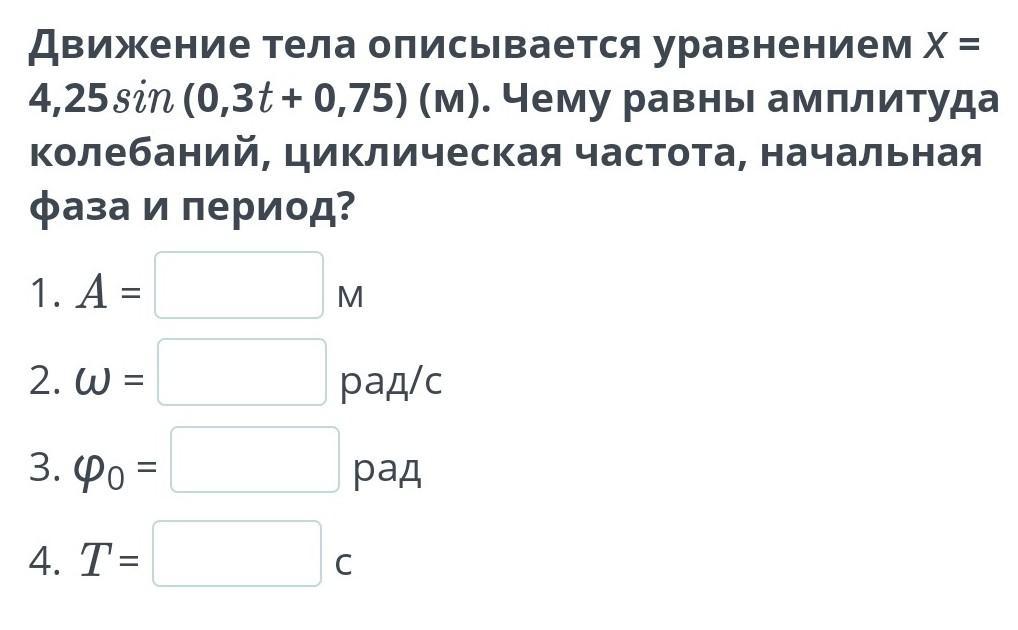 движение тела описывается уравнением X=4,25sin(0,3t+ 0,75)(м) Чему равна амплитуда колебаний, циклическая частота начальная фаза и период