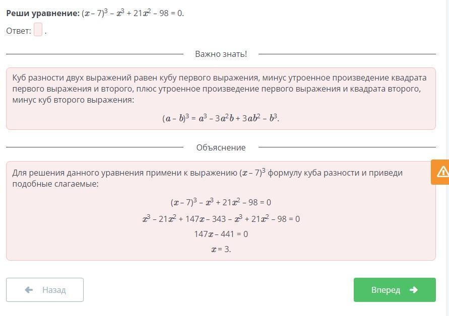 Реши уравнение: (x – 7)3 – x3 + 21x2 – 98 = 0.
