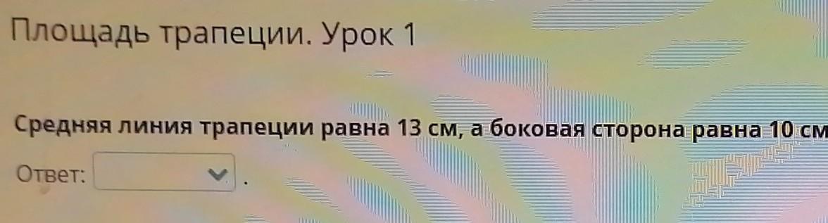 Средняя линия трапеции равна 13 см, а боковая сторона равна 10 см и составляет с меньшим основанием угол в 150°. Найди площадь трапеции