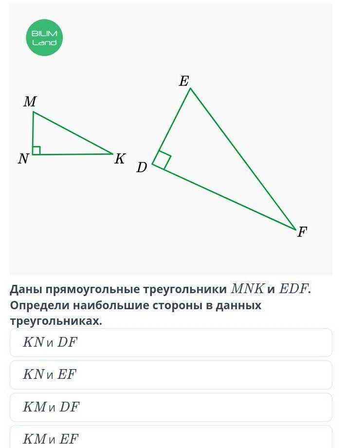 Даны прямоугольные треугольники MNK и EDF. Определи наибольшие стороны в данных треугольниках.
