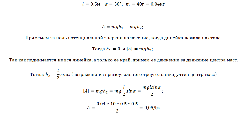 Лежавшую на столе линейку длиной 0,5 м ученик поднял за один конец так, что она оказалась наклоненной к столу под углом 30 градусов. Какую минимальную работу совершил ученик если масса линейки 40 г?