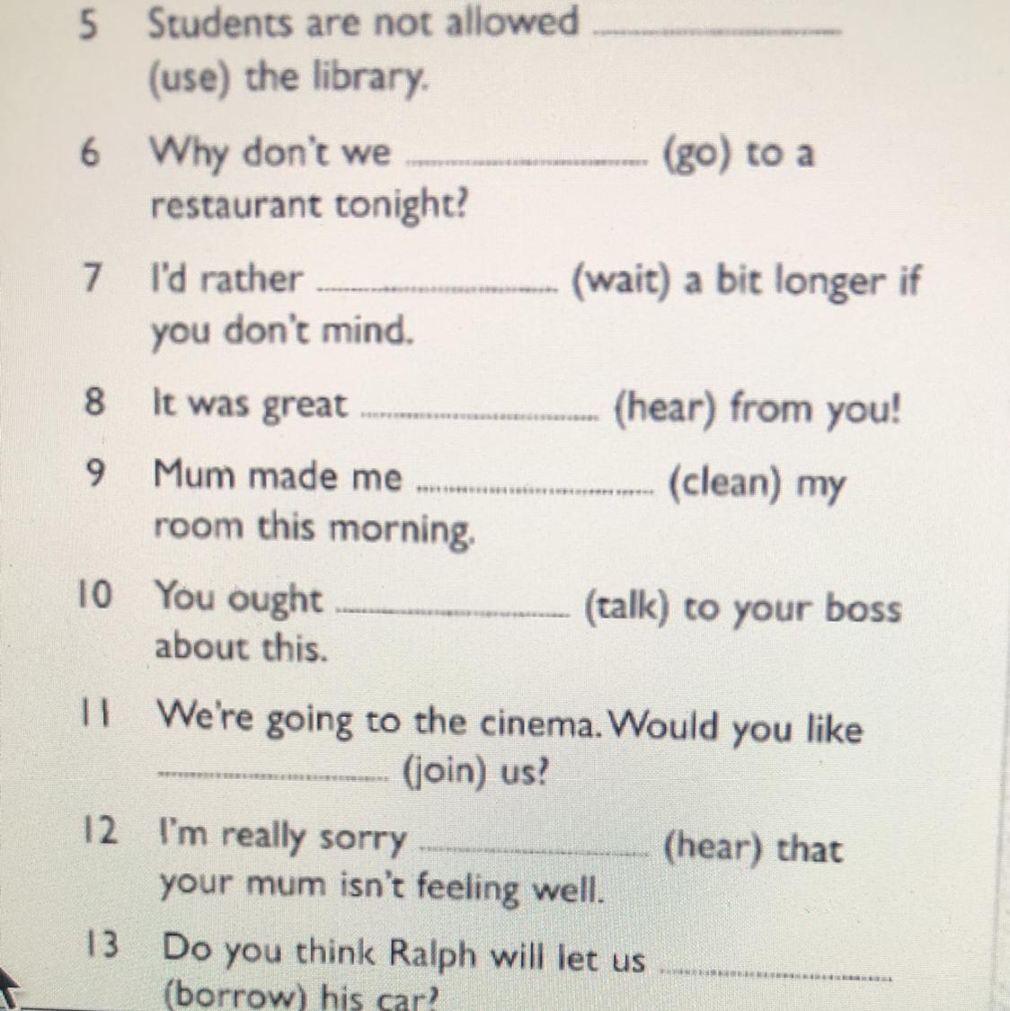 Ответ:5)to use,6)go,7)wait,8)to hear,9)clean,10)talk,11)to join,12)to hear,13)Borrow