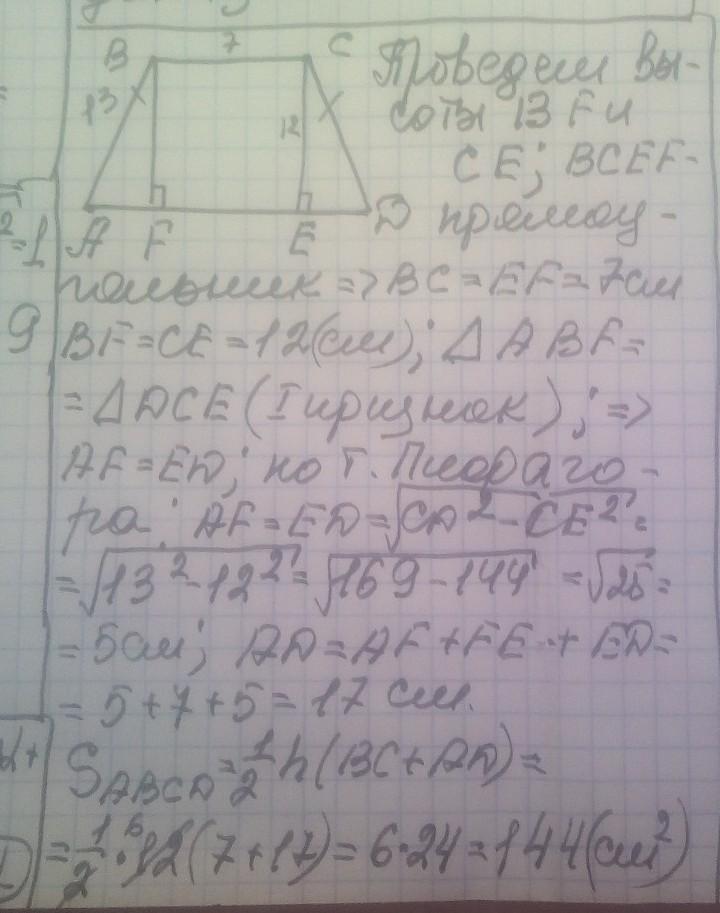 Меньшее снование равнобедренной трапеции равно 7см, боковая сторона равна 13 см, а высота равна 12 см. Найдите площадь этой трапеции .