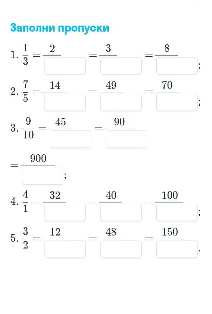 1. 1/3 = 2/6 = 3/9 = 8/24 2. 7/5 = 14/10 = 49/35 = 70/50 3. 9/10 = 45/50 = 90/100 = 900/1000 4. 4/1 = 32/8 = 40/10 = 100/25 5. 3/2 = 12/8 = 48/32 = 150/100