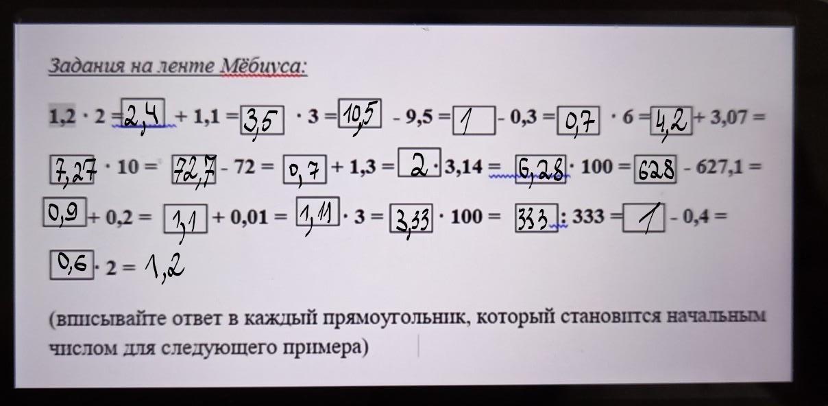 1,2 * 2 = 2,4 + 1,1 = 3,5 * 3 = 10,5 - 9,5 = 1 - 0,3 = 0,7 * 6 = 4,2 + 3,07 = 7,27 * 10 = 72,7 - 72 = 0,7 + 1,3 = 2 * 3,14 = 6,28 * 100 = 628 - 627,1 = 0,9 + 0,2 = 1,1 + 0,01 = 1,11 * 3 = 3,33 * 100 = 333 : 333 = 1 - 0,4 = 0,6 * 2 = 1,2