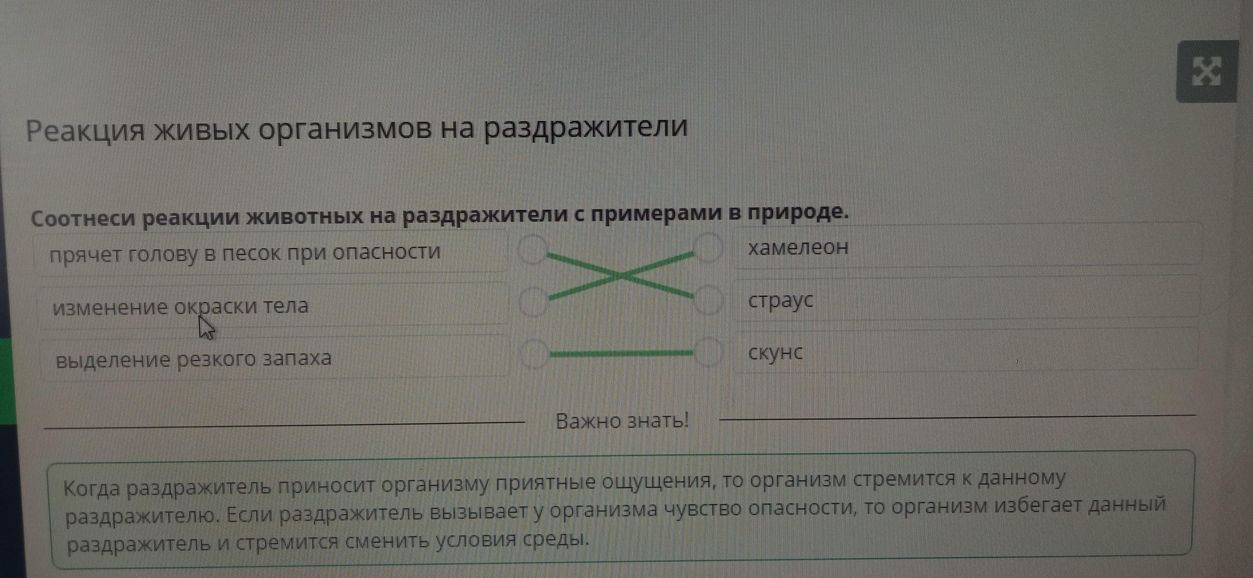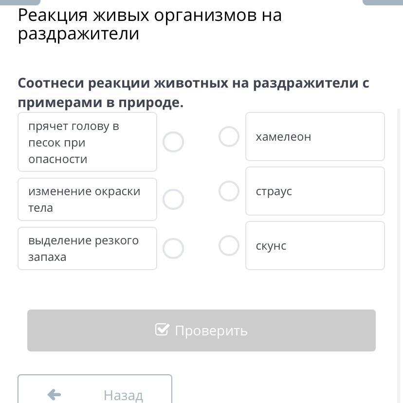 Соотнеси реакции животных на раздражители с примерами в природе.